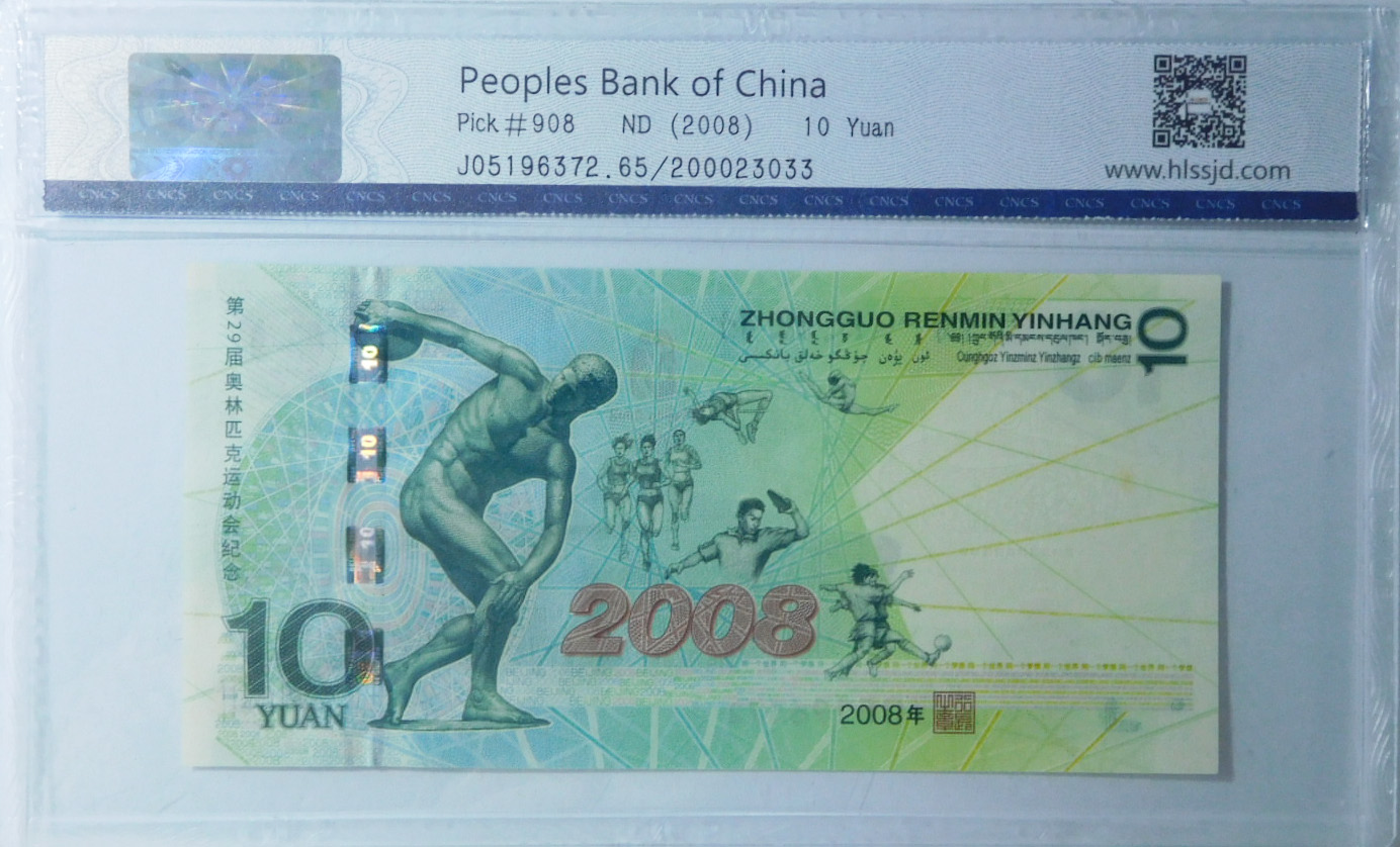 中國人民銀行于2008年7月8日發行第29屆奧林匹克運動會紀念鈔,面額10元。主色調為藍綠色,票幅長148.5毫米,寬72.0毫米。全國發行600萬張,與現行流通的人民幣具有相同職能,與同面額人民幣等值流通。