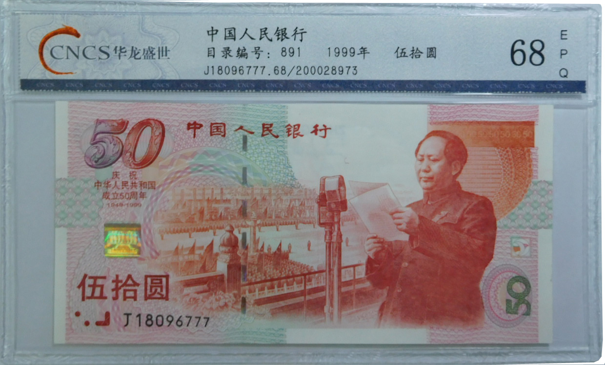 1999年9月20日,為慶祝中華人民共和國成立五十周年,中國人民銀行面向全國發行“中華人民共和國成立五十周年”紀念鈔一張,面額為50元,發行數量為5000萬套,紀念鈔正反面主色調均為紅色,票幅長165毫米,寬80毫米。
