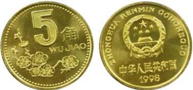梅花5角硬幣直徑20.50毫米,厚1.65毫米,質(zhì)量3.80克。幣正面為梅花圖案,面值黑體字"5角",并注漢語拼音"WUJIAO"。幣外周柱面間斷鑄有6段直齒,每段8條。背面圖案為國(guó)徽、宋體漢字"中華人民共和國(guó)"、"ZHONGHUARENMINGONGHEGUO"、阿拉伯?dāng)?shù)字年號(hào)。