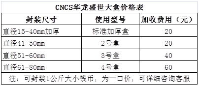 【以上優惠活動限“標準鑒評”,如送評錢幣需大盒封裝(錢幣直徑41mm-100mm)大盒另收費用,即實際費用為:標評評級費x折扣數+大盒費用,具體收費標準請參考CNCS官網)。