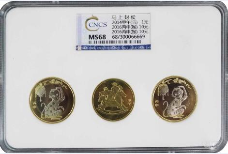 CNCS推出最新“馬上封侯”生肖評級幣套裝啦,此次評級的套裝“馬上封侯”由一枚馬年生肖紀念幣和兩枚猴年生肖紀念幣組成,組合新穎,寓意深刻。此次CNCS推出的“馬上封侯”的生肖評級套裝,是由一枚馬年生肖紀念幣(一輪)和兩枚猴年生肖紀念幣(二輪)組成。排列順序是馬年生肖紀念幣在中間,兩枚猴年生肖紀念幣(二輪)在兩側。